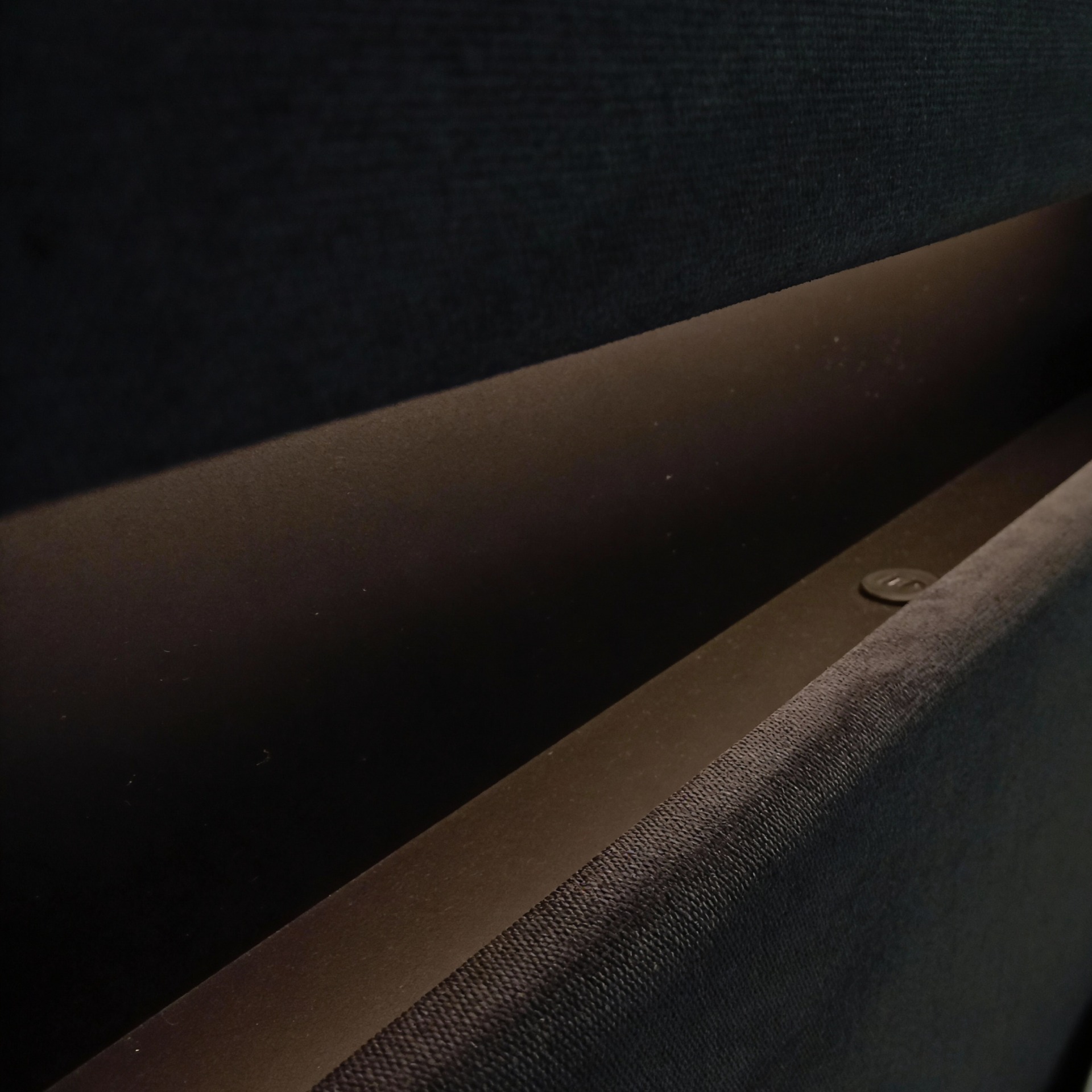 Muhkea, ylellinen kokonaisuus – musta verhoilu + pääty (valaistus & USB) viimeistelevät ilmeen.