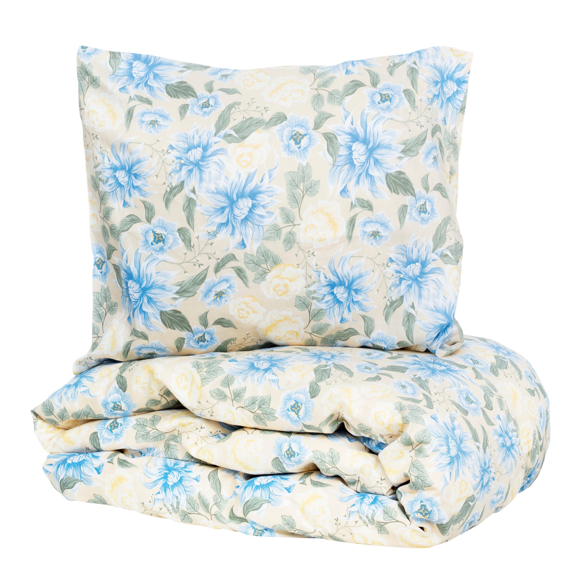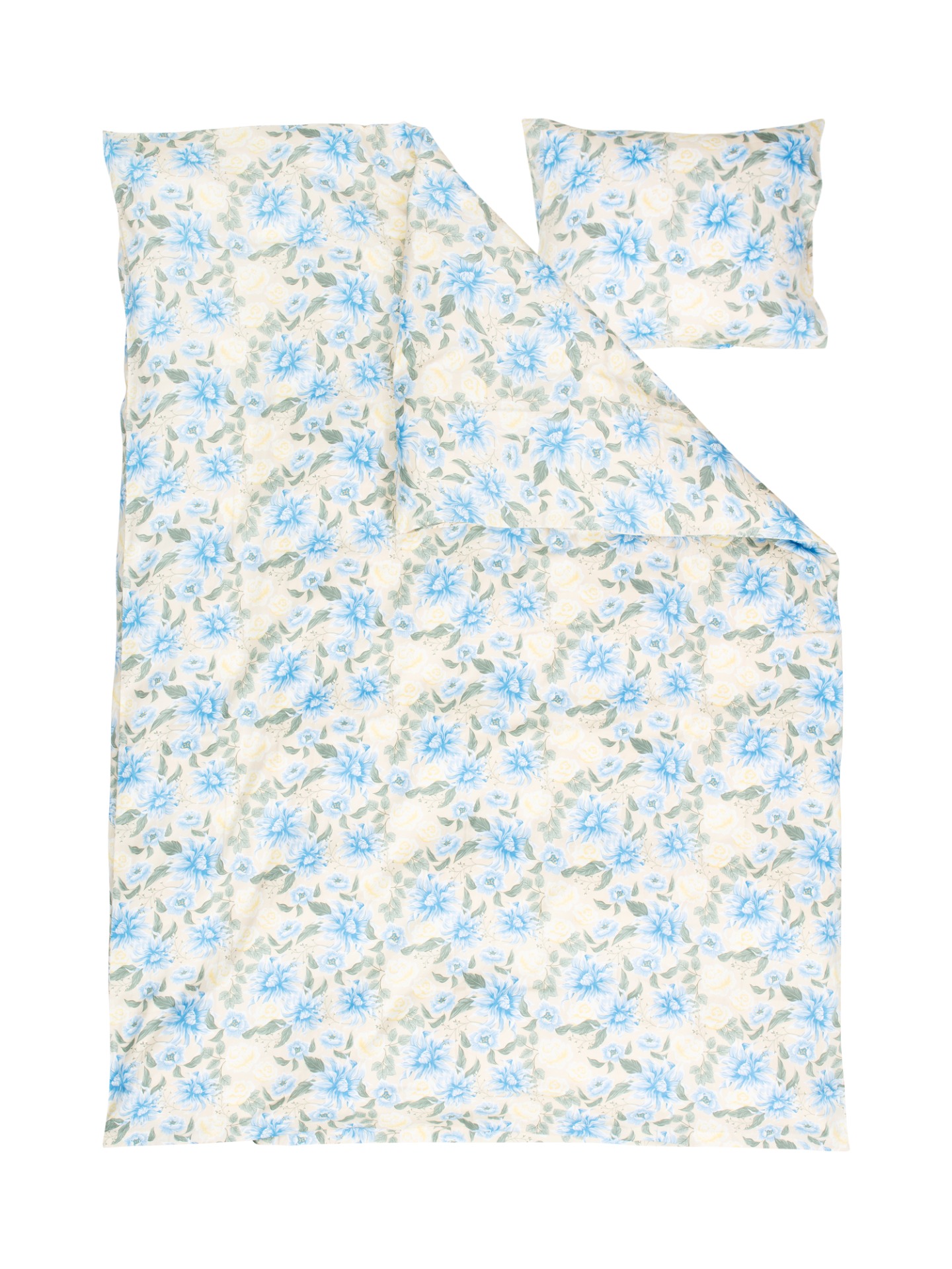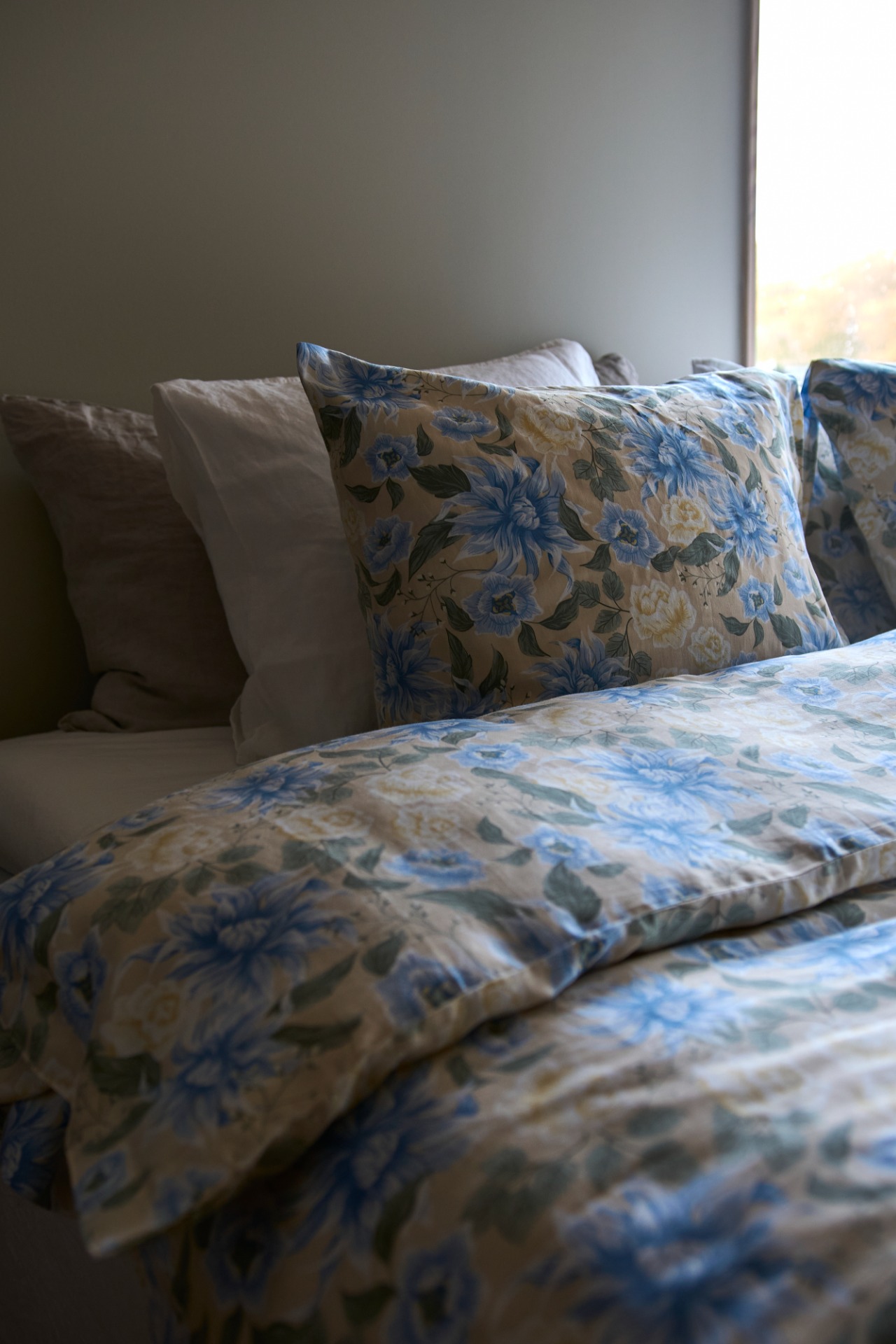 Ylellisen pehmeä Bollungen-pussilakanasetti kutsuu rentoutumaan tyylillä. Kermansävyiselle pohjalle levittäytyvät herkät siniset ja keltaisen sävyiset kukat tuovat makuuhuoneeseen rauhallista eleganssia ja raikasta romantiikkaa. Kuosi on ajaton – yhtä aikaa moderni ja klassinen.