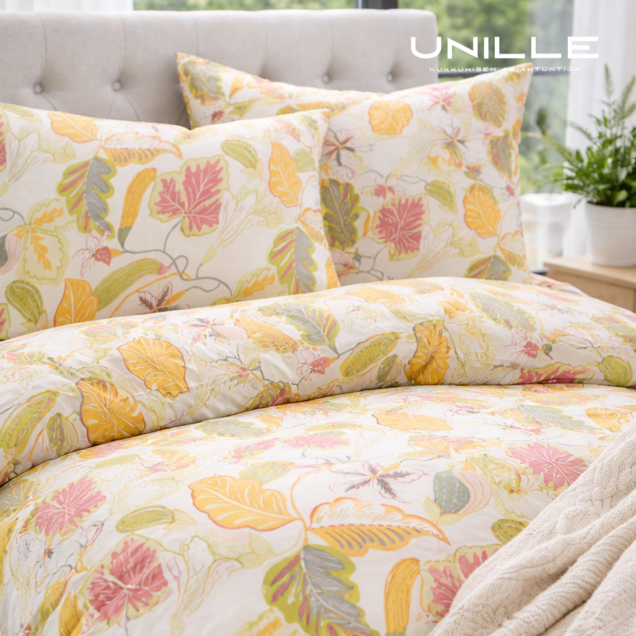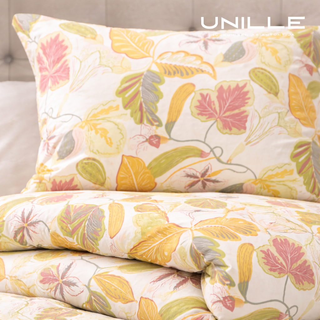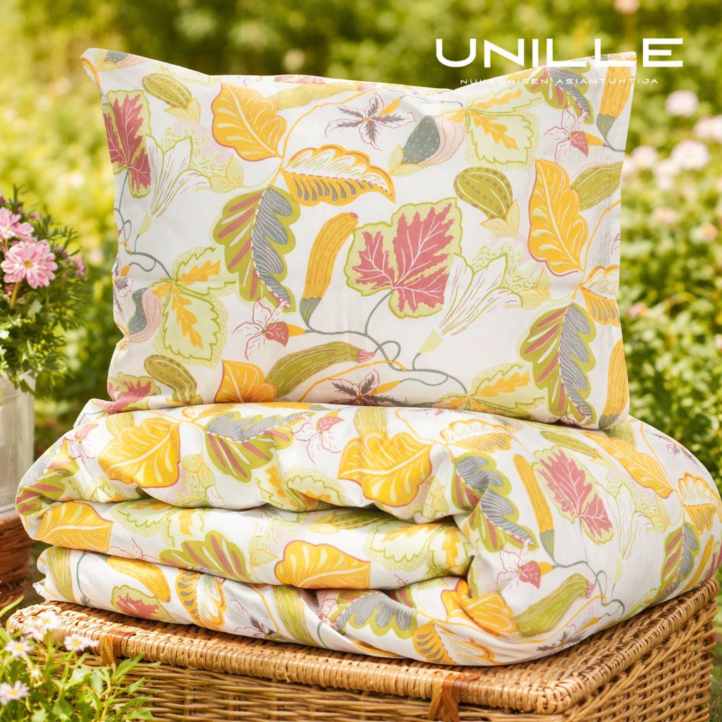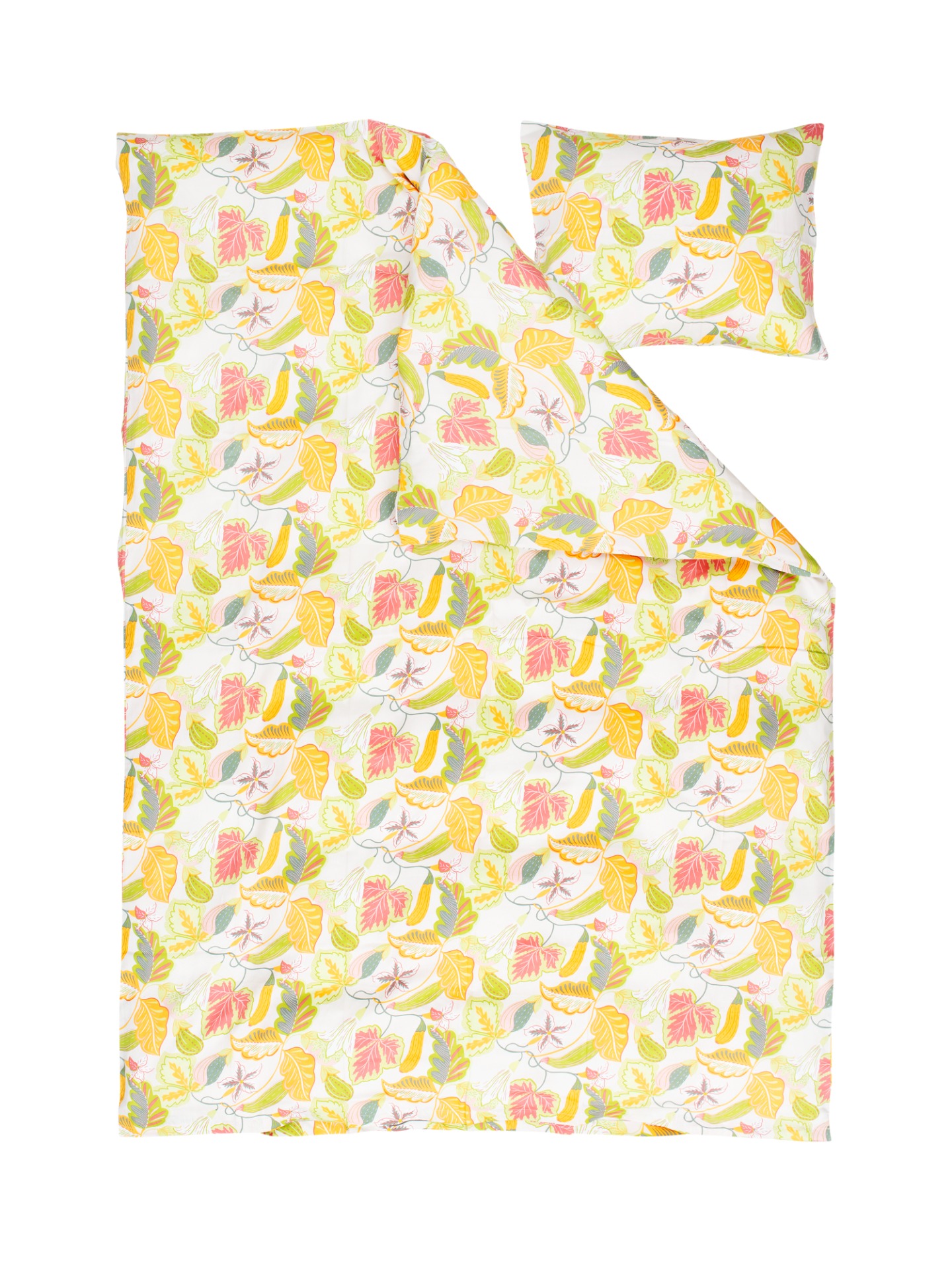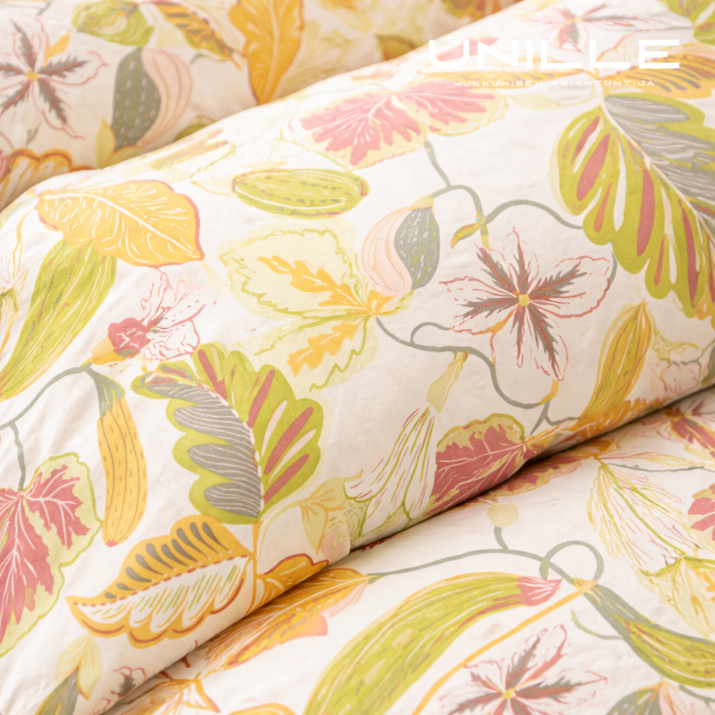 Brunnberg-pussilakanasetti tuo makuuhuoneeseen mukavasti väriä. Valkoisella pohjalla keltaisen, vihreän ja punaisen sävyjä kasviaiheisella kuvioinnilla – ihanaa värikkyyttä tylsyyttä vastaan.