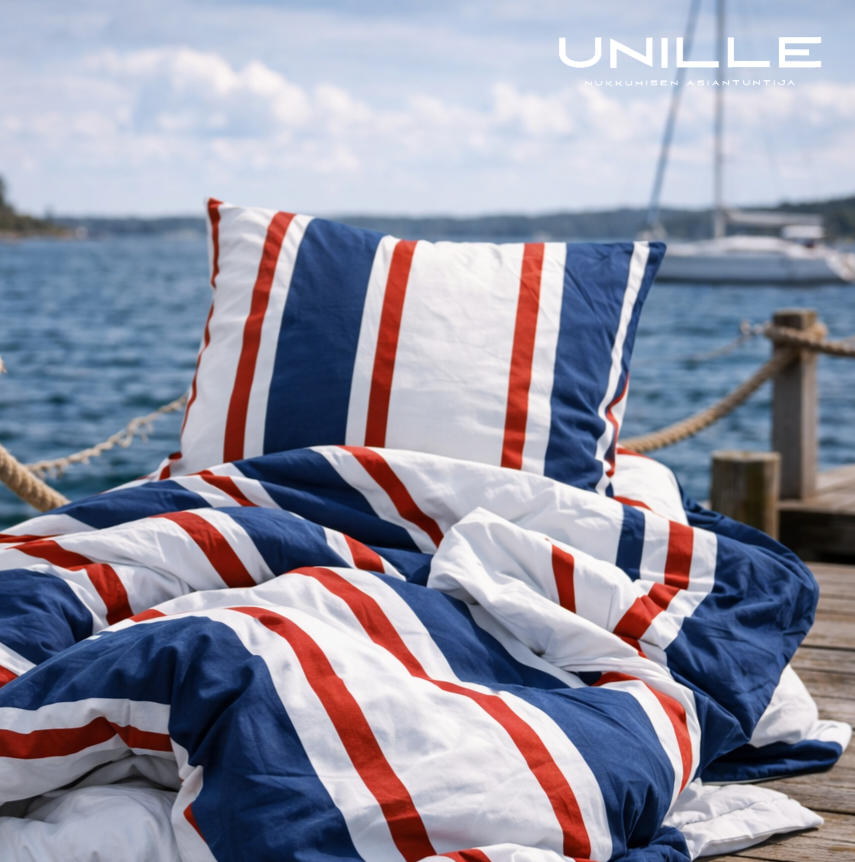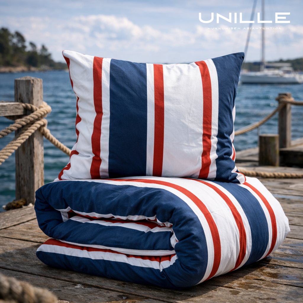 Raikas ja ajaton merihenkinen pussilakanasetti tuo makuuhuoneeseen levollista tunnelmaa ja kevyttä kesäfiilistä ympäri vuoden.