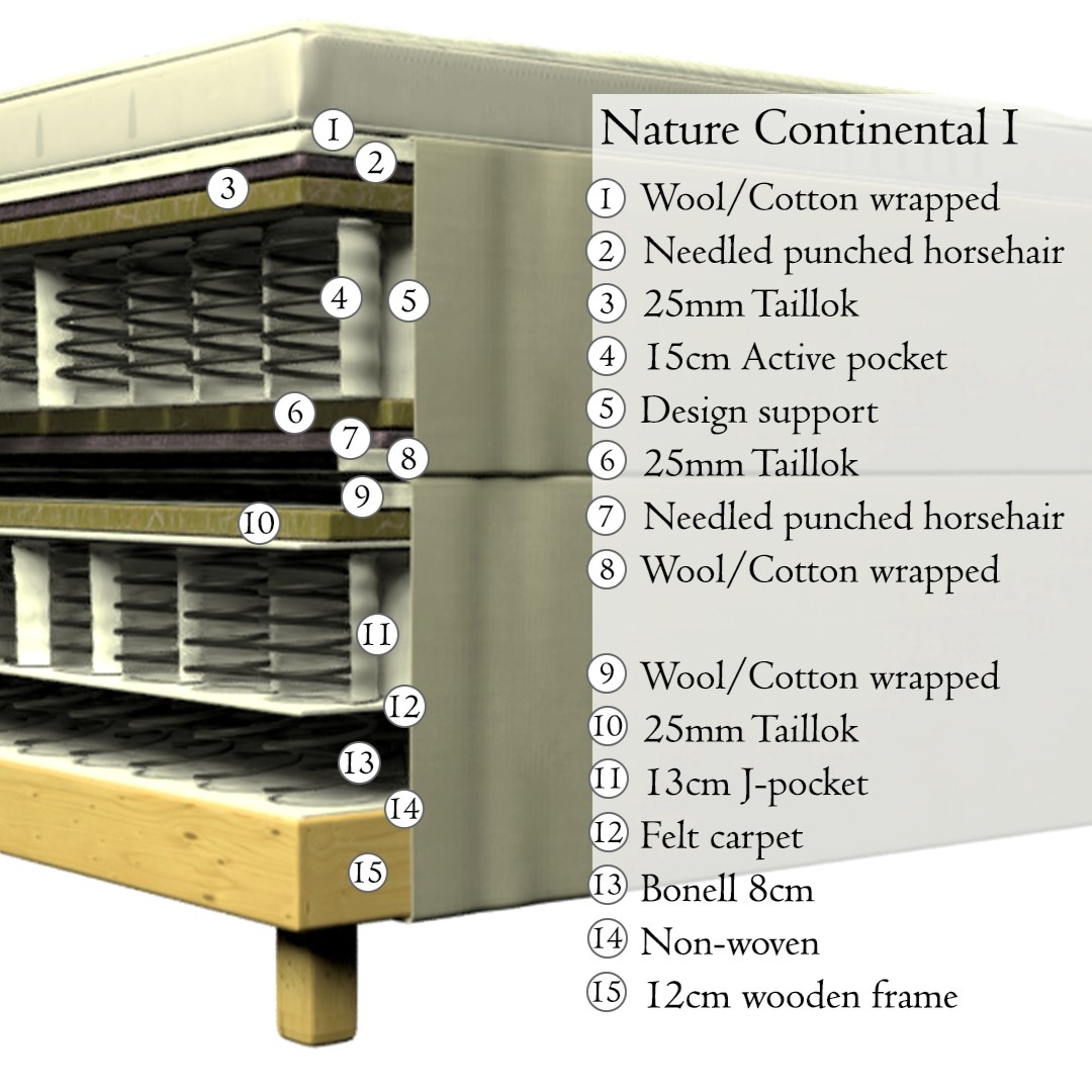 Nature Continental I tarjoaa luonteeltaan rauhallisen ja hengittävän nukkumiskokemuksen. Luonnonmateriaalikerrokset (villa/puuvilla + hevosenjouhi) tukevat ilmankiertoa ja auttavat pitämään olosuhteen miellyttävänä.