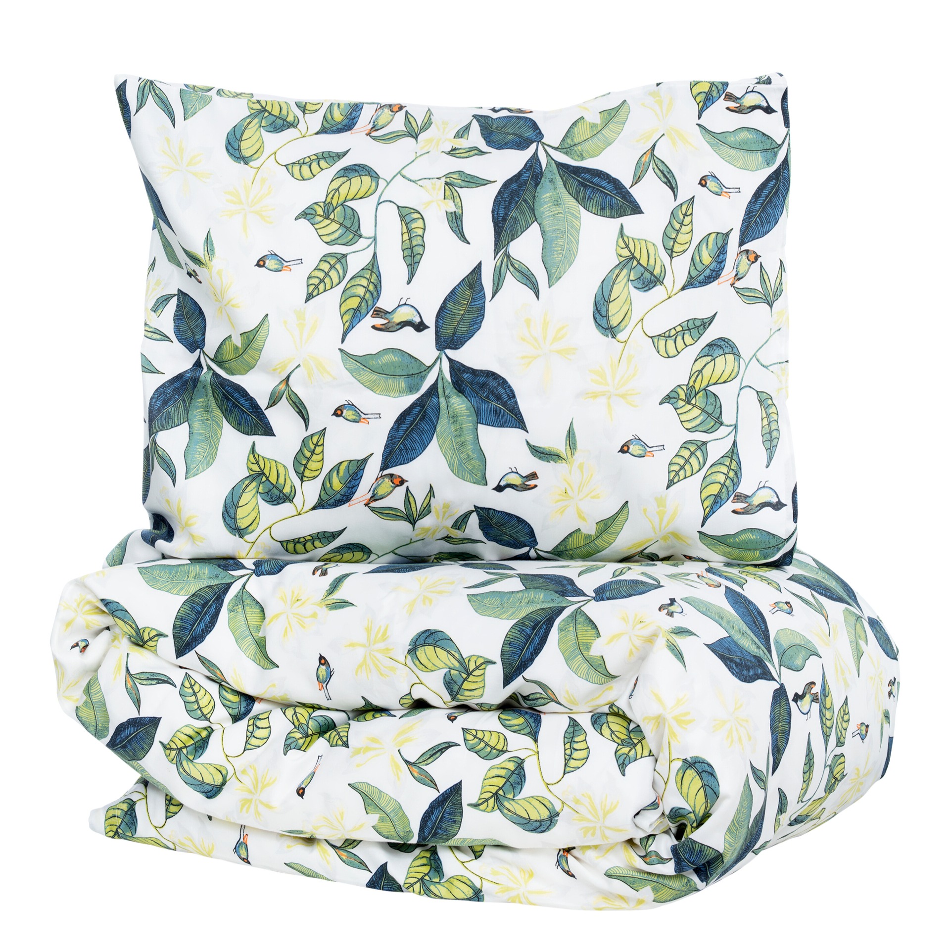 Stale-pussilakanasetti tuo makuuhuoneeseen hillittyä väriä. Valkoisella pohjalla hurmaava vihreän turkoosi lehtikuvio ja pikkuruisia lintuja. Värit ovat kesäisen raikkaat ja niistä tulee mieleen sademetsien rauhoittavat sävyt.